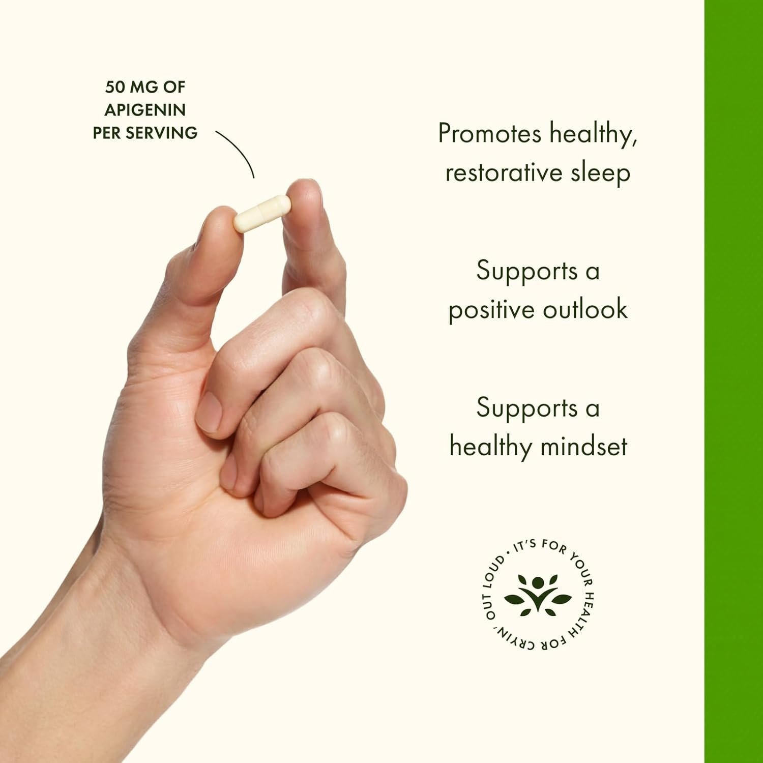 Apigeninas – natūralus flavonoidas, randamas augaluose, skirtas atsipalaidavimui, hormonų pusiausvyros palaikymui ir ląstelių apsaugai. Vienoje kapsulėje yra 50 mg veikliosios medžiagos.