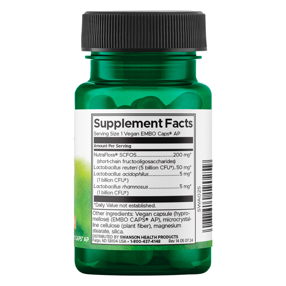 probiotikai, Lactobacillus reuteri, rhamnosus, acidophilus, žarnyno sveikata, prebiotikai, scFOS, Swanson, virškinimas, kapsulės, veganams