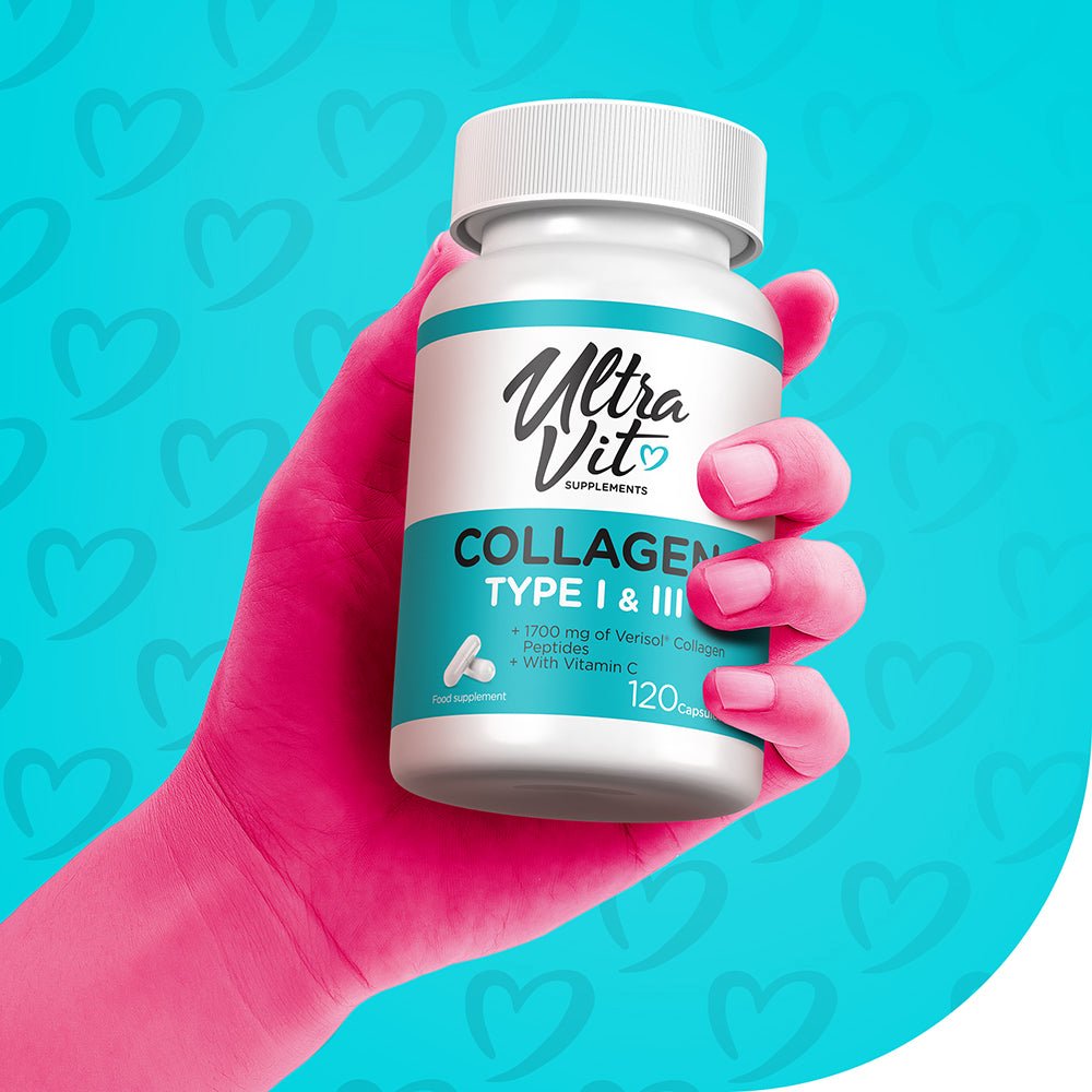 UltraVit Collagen Type I & III – kolageno kapsulės su Verisol® hidrolizuotais peptidais ir vitaminu C. Vienoje dienos porcijoje – 1700 mg kolageno ir 40 mg vitamino C (50 % RMV). Palaiko odos elastingumą, plaukų ir nagų grožį bei sąnarių ir kremzlių sveikatą. Be glitimo, be laktozės, be GMO.